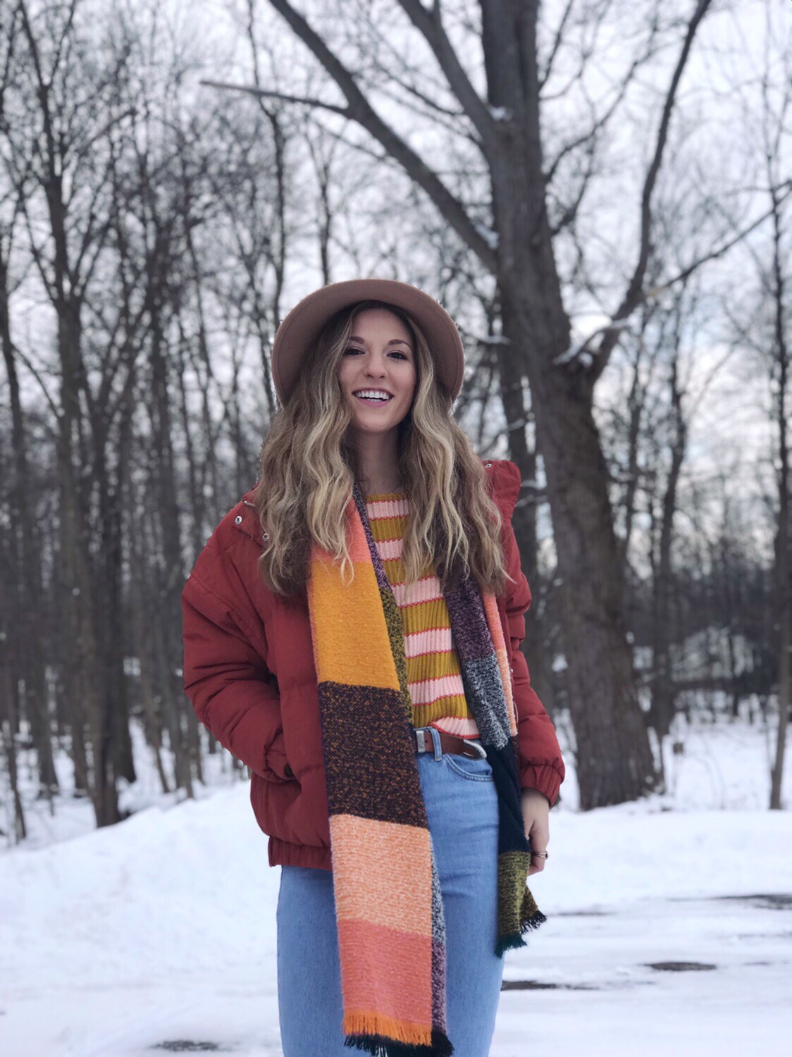 Puffer Coat (Sparkz Copenhagen – found at Anthropologie), Sweater (Free People), Belt (Urban Outfitters), High-Waisted Jeans (Topshop – found at Nordstrom Rack), Scarf (Anthropologie – no longer available), Bucket Bag (Fount)