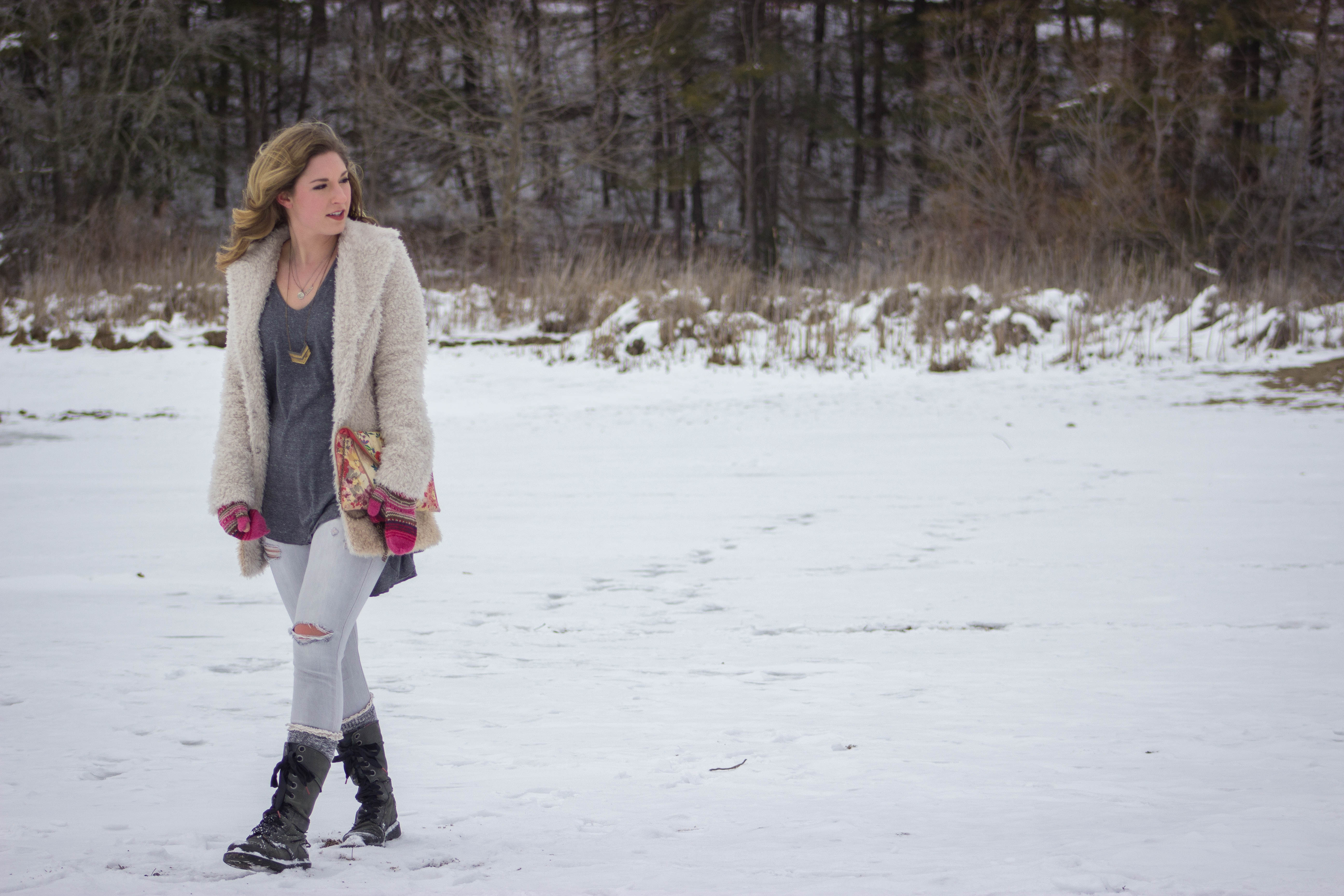 Tunic: (Free People), Grey Denim: (American Eagle Outfitters), Jacket: (Anthropologie), Purse: (Urban Outfitters), Mittens: (Sundance Catalog)