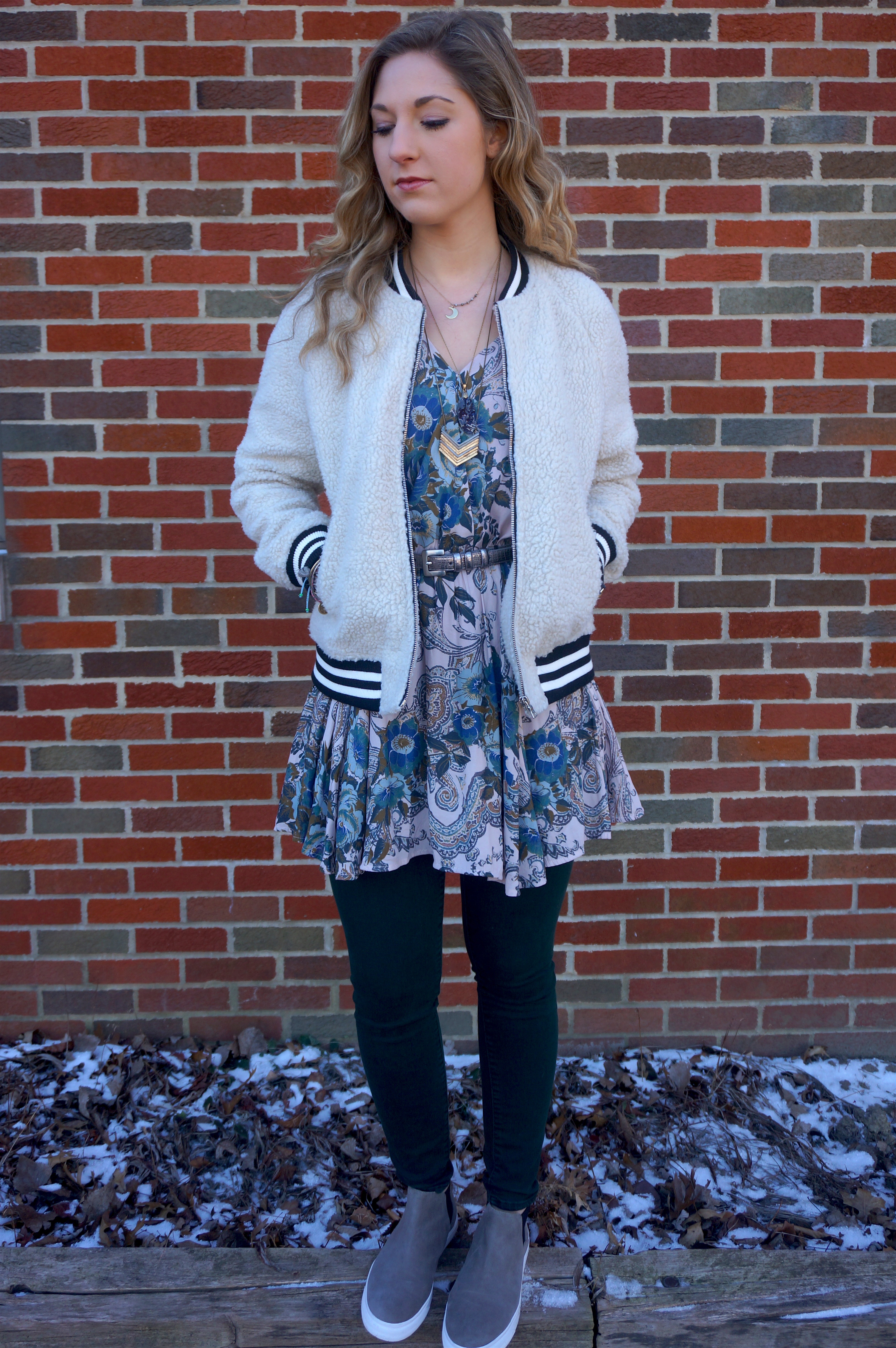 Tunic (Free People), Pants (The Gap), Jacket (Urban Outfitters) Shoes (Nordstrom Rack), Blue Stone Necklace (Brooklyn Charm), Arrow Necklace (Madewell), and Moon Necklace (Islands by Amity)