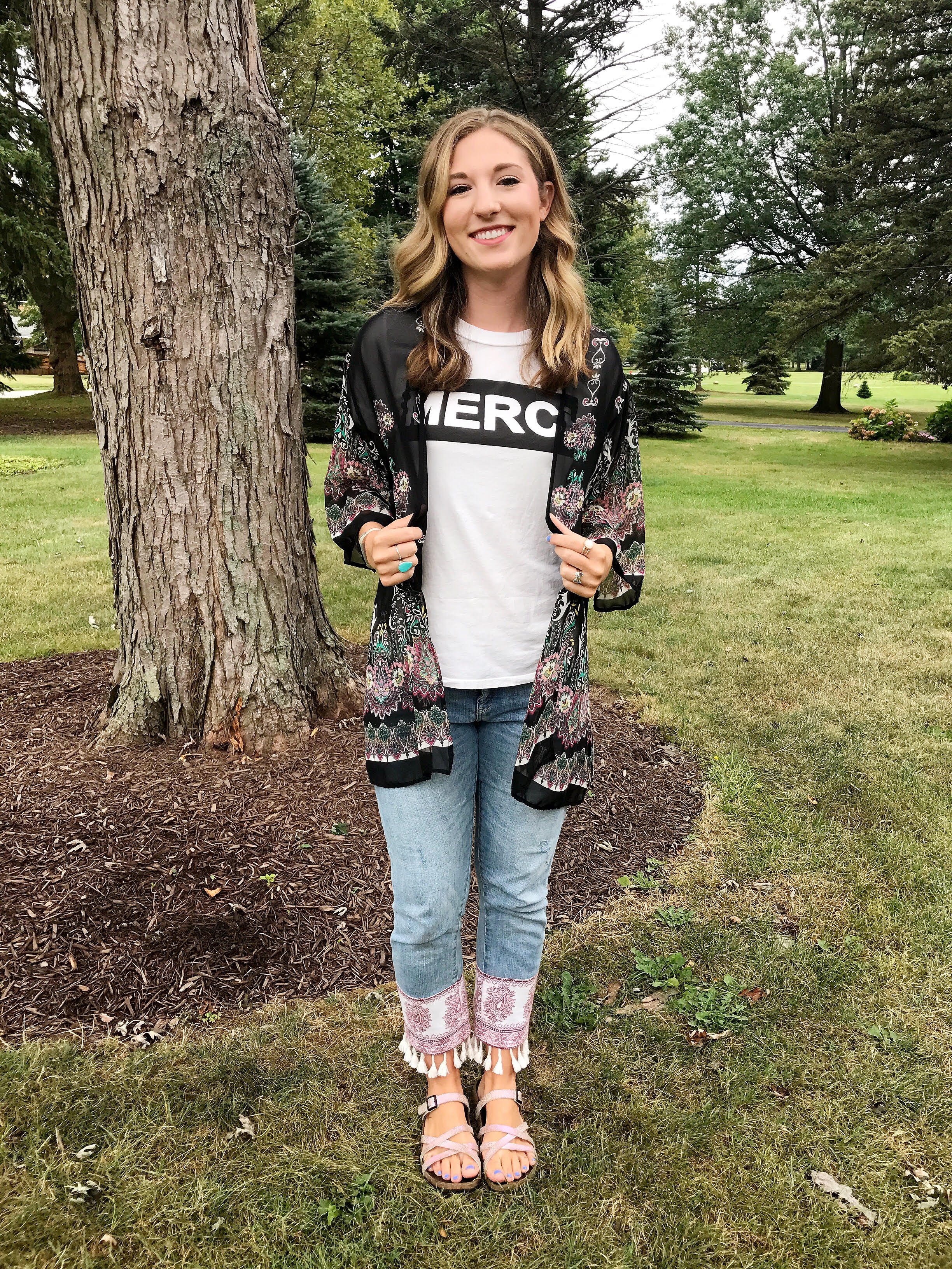 Kimono (Nordstrom Rack), Merci Tee (Anthropologie), Tassel Jeans (Anthropologie), Sandals (Birkenstocks, similar here)