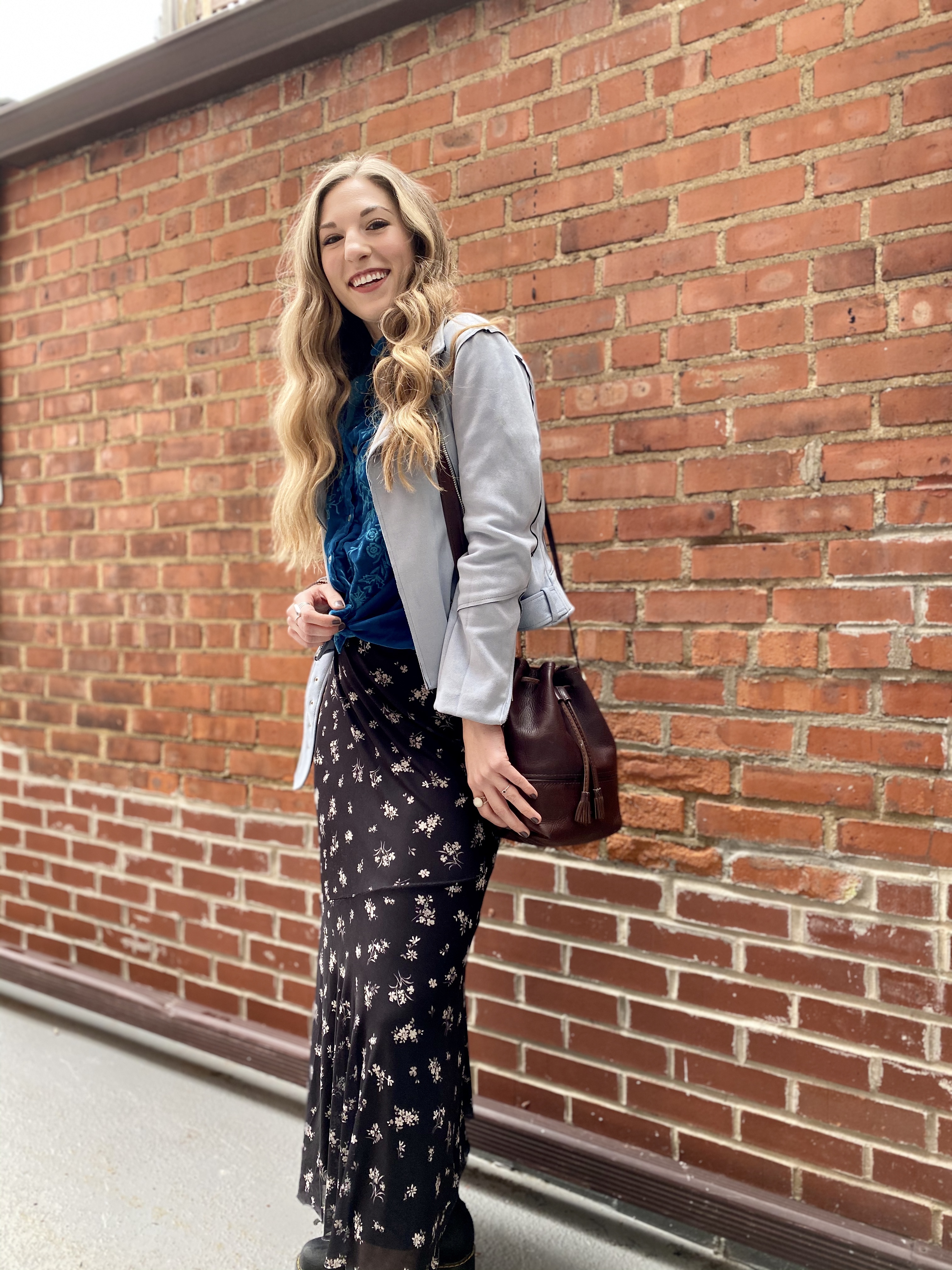 Anyways, this outfit incorporates another skirt, of course, but I’ve layered it with a blouse and jacket. I love layering, and although I don’t really like Cleveland winters, I do like layering fun textures and patterns. When I’m choosing blouses to wear with a skirt, I look for ones that have less volume, or ones that I can easily tie. I’m all about the knot when it comes to blouses and skirts. I really hate tucking blouses into skirts because I feel like a corporate crony, so I try to avoid it as much as possible!